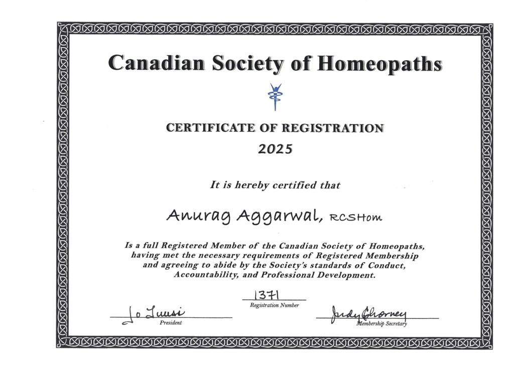 Anurag Aggarwal is a registered member of the Canadian Society of Homeopaths, reflecting his adherence to professional standards and ongoing commitment to excellence in homeopathic practice. With a passion for personalized care and a deep understanding of homeopathic principles, Anurag strives to empower his patients on their journey to health and wellness through Homeopathy in Surrey. His practice, a Homeopathic clinic in Surrey, is characterized by a compassionate approach, where each treatment plan is tailored to meet the unique needs of individuals, addressing not just symptoms but also underlying imbalances for long-lasting results.